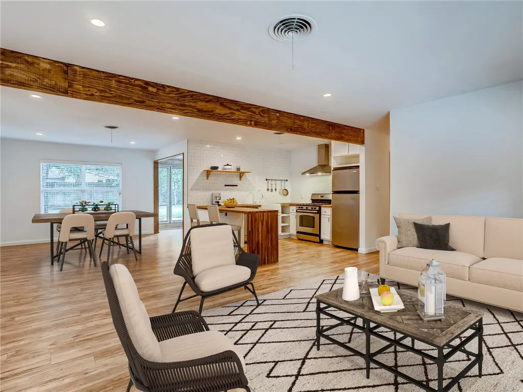 Super hip, modern home on a quiet street close to everything. Walking in, you are greeted by ample living space with two separate living rooms, a modern kitchen, and a wood-burning fireplace. Down the hallway from the kitchen are spacious bedrooms and modern bathrooms. New paint throughout, recessed lighting, HVAC, and upgraded electric from 2015. Brand new roof (2021.) Outside, enjoy a large lot with wood decking and a huge storage shed. Perfect for backyard barbecues. This home is turn-key and move-in ready. Minutes from Downtown, a walk and bike area, 2 min to the Mueller development with a great HEB, shops and more.