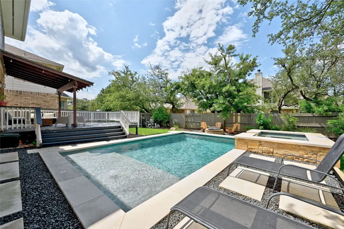 Imagine being poolside this summer! This South Austin 2-story home had this gorgeous in-ground pool and hot tub built in 2022, with a covered back deck to lounge in. The spacious home with 4 bedrooms and 2.5 bathrooms has high ceilings and natural light throughout. Three large living areas with built-in shelving, two dining areas including a breakfast nook with a pool view, and a bonus office space upstairs. The kitchen opens to the family room and there is plenty of cabinetry, counter space, and storage for all your needs! The expansive primary bedroom has an amazing walk-in closet, adjoining to the primary bathroom with dual vanities, soaking tub and separate shower. Plantation shutters throughout, no carpet except on the stairs, and gorgeous updates including fixtures and paint, make this home inviting and comfortable. Great location and zoned for top-rated Austin schools, Mills Elementary and Bowie High School. Located within 12 mile of Mills, and 1 mile of HEB, restaurants, parks and more! Owners will include pool, lawn, and pest control maintenance refrigerator, washer, and dryer included.