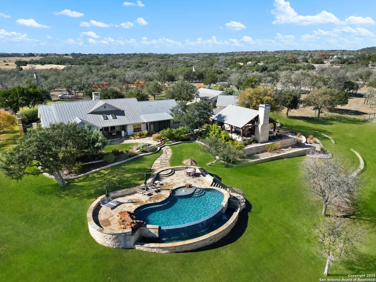 Welcome to this manicured 51-acre ranch surrounded by hill country views in a 900-acre gated pastoral community. Enter the property via private gate, drive the paved, winding tree-lined road past the flag to the main home, guest cabin, entertainment pavilion. The primary home is a 3-bed, 2-bath (3389 sqft) home and 1-bed, 1-bath guest cabin that features vaulted wood and beam ceilings, massive fireplace, wood stove, alder and rock walls, walk in showers, granite countertops, outside screened dining and covered sitting areas with panoramic views. There is parking for 10, windmill, cedar encased cistern, flagstone walkways, custom iron gates, large private courtyard, extensive irrigation and 2 excellent wells, rock bordered raised flower beds, 3 septic systems, 60kw diesel generator with 750-gallon fuel capacity, livestock buildings with paddocks, large barn, fencing, shooting range, seasonal creek, pond, hot tub, swimming pool, and a covered concrete slab RV pavilion with 50-amp service. This property is a haven for year-round outdoor entertainment as well as ultimate comfortable and cozy inside living. Wildlife is abundant, hunting is allowed, with a wildlife tax exemption for each residence. Property Address 431 Bluff Creek Rd., Center Point, TX 78010.