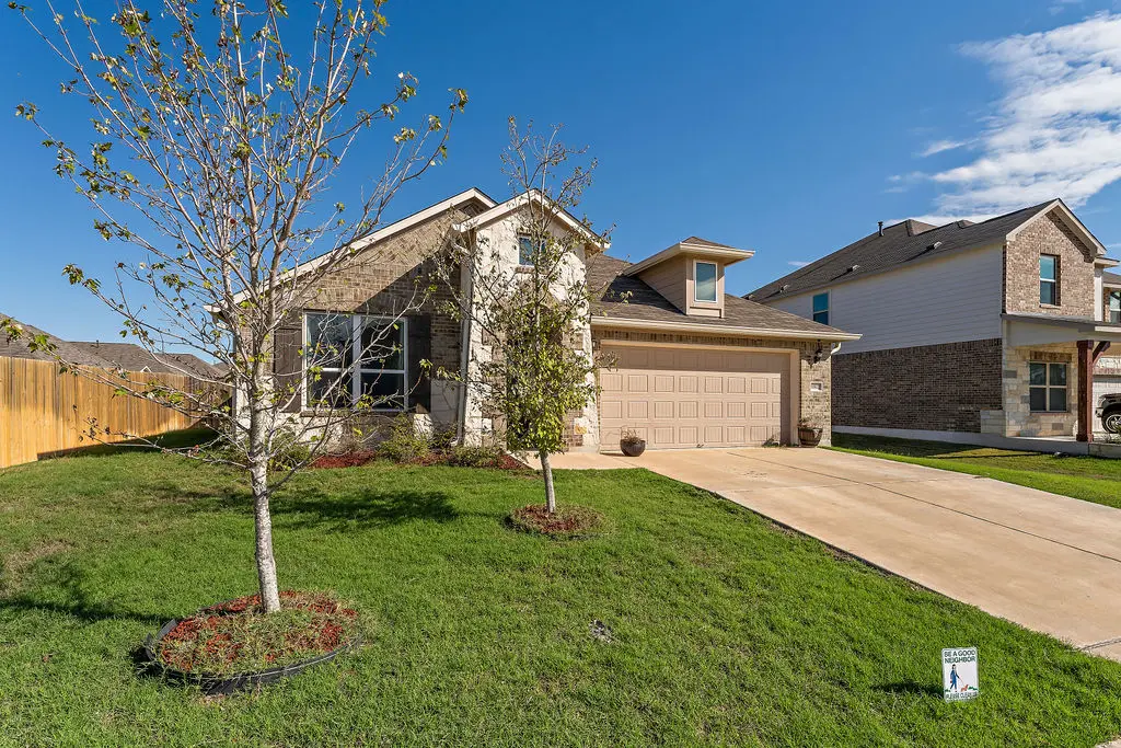 Come check out this amazing home on a huge lot in the quiet and much sought after Lagos community in Manor. There is a flex room at the entry that can be used for whatever your needs are, office, playroom, or extra living space, which leads to the kitchen and main living area with an open concept. Tall ceilings, crown molding, and wood wall accents throughout the home. The kitchen has Stainless Steel appliances, built in oven and gas cooktop, quartz countertops, and plenty of room for prep for any level of home chef and is open to the main living area for entertaining friends or family. The master suite is huge with room for a sitting area or possible nursery, and some room for a desk if you need it. The master bath has double vanities, tons of storage, and a separate shower with a soaking tub as well. Out back you have a covered patio and a huge backyard with a raised garden bed and a firepit area with wrap around seating for those nights when you want to entertain or just be outside next to a warm fire. Water softener and Electric Car Charger in Garage.