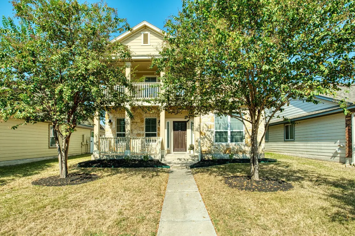 Welcome to this stunning two-story home, offering both style and functionality. Open concept floor plan features beautiful wood flooring through the living area, making maintenance a breeze. Downstairs, a versatile bonus room with elegant French doors can easily serve as a home office or additional living space, catering to your lifestyle needs. The spacious kitchen is a chefs dream, equipped with upgraded fixtures, granite countertops, stainless steel appliances, and a breakfast bar ideal for casual dining. Conveniently nestled between the kitchen and dining room is a half bathroom. Upstairs, the owners suite features a spacious walk-in-closet and private balcony, perfect for enjoying your morning coffee or evening breeze. The en-suite provides a touch of luxury with its double vanity and walk-in shower. Alongside the primary suite, youll find two additional well-appointed bedrooms and a second bathroom. This home is situated in a serene community that offers a peaceful lifestyle, with access to a beautiful greenbelt for relaxing outdoor strolls. Residents also enjoy exclusive access to a refreshing community pool. minutes from TX-45, SH-130, and Dell.