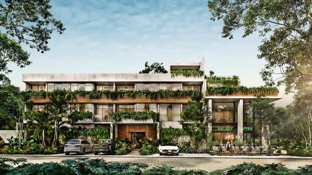 A corner residential development located on Region 15, one of the new Premium areas with the highest added value in Tulum, due to its proximity to the beach, easy access to Av. Kukulkan and Av. 5, to the commercial area of Aldea Zama and to downtown.The 3-level project consists of a total of 39 1-bedroom apartments, with 2 different typologies of 55 or 65 m2. Each unit consists of a living-dining room, kitchen, bedroom, terrace or patio and laundry area, and are delivered fully equipped.