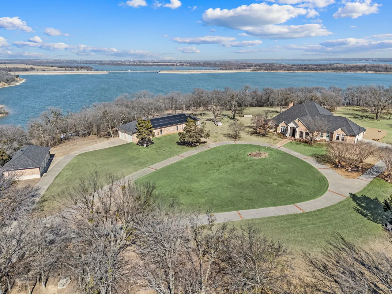 Exclusive lakeview estate lease overlooking Lake Ray Roberts. This secluded brick residence sits on 5.15 manicured acres with sweeping panoramic water views and a private walking path to the shoreline. The open concept floor plan offers 4 bedrooms, 3 baths, a private office, and an inviting living area with a wood burning fireplace framed by expansive windows. Premium features include solar panels, a whole home generator, and a built in safe room for comfort and peace of mind. Additional highlights include a separate shop garage with ample covered parking. Enjoy refined lake living just a short drive from the DFW Metroplex, offering privacy without sacrificing convenience. Rare lease opportunity.